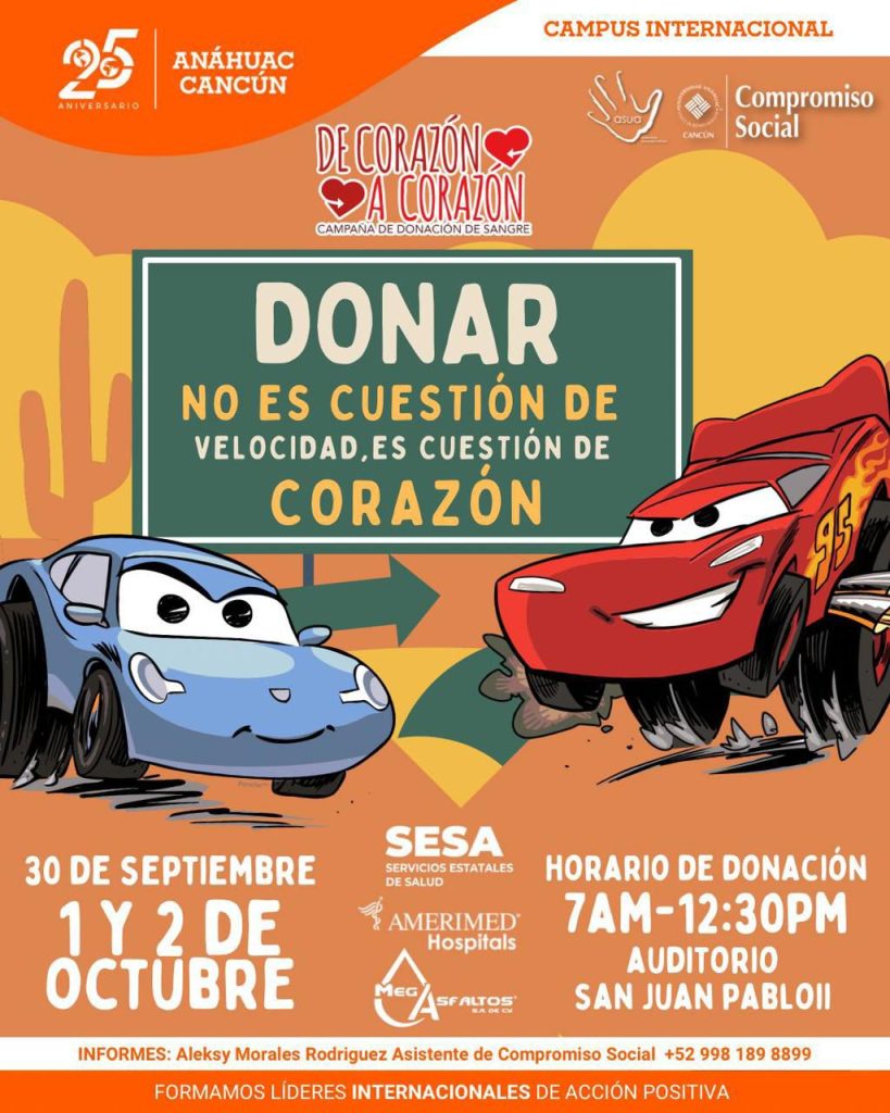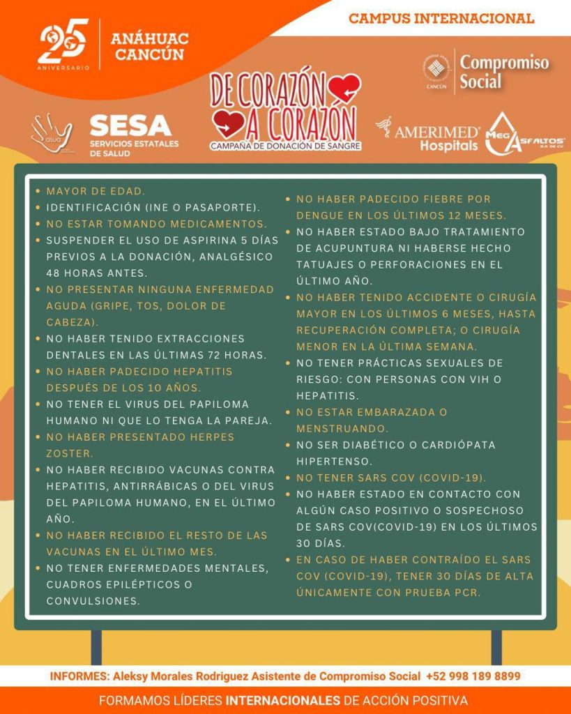 Con el lema “Donar sangre es donar vida”, la Universidad Anáhuac Cancún lleva a cabo la campaña de donación de sangre “De corazón a corazón”, del 30 de septiembre al 2 de octubre en el auditorio San Juan Pablo II, en un horario de 7:00 de la mañana a 12:30 del día, anunció la gobernadora Mara Lezama Espinosa.
