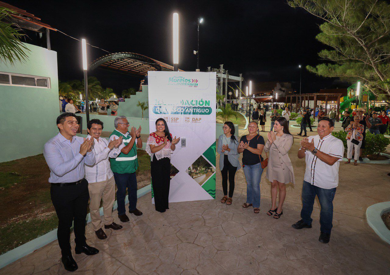 Puerto Morelos, Quintana Roo, 30 de noviembre de 2025.— La presidenta municipal Blanca Merari Tziu Muñoz puso en servicio 260 nuevas luminarias instaladas en el Parque Fundadores y sus alrededores, en el Casco Antiguo, en las que se invirtieron 3 millones de pesos provenientes del Fideicomiso de Administración del Derecho de Saneamiento Ambiental (DSA).