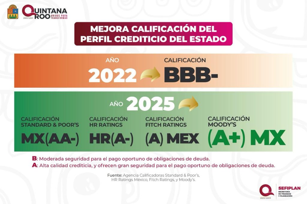 Este logro se suma al aumento en la calificación de la Agencia Fitch Ratings, que el pasado 10 de junio elevó la calificación de BBB+ a A. Ambas acciones son un reconocimiento al esfuerzo conjunto de la ciudadanía y del Gobierno de Quintana Roo. La disciplina financiera del Estado de Quintana Roo es hoy un ejemplo nacional, el cual se continuará fortaleciendo para que cada avance se refleje en bienestar y desarrollo para las y los quintanarroenses. Esta mejora en la calificación crediticia refleja el compromiso del Gobierno del Estado con el manejo responsable, eficiente y transparente de las finanzas públicas, lo que fortalece la confianza de inversionistas y agencias calificadoras en la solidez económica de Quintana Roo.