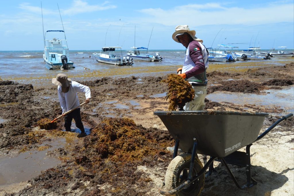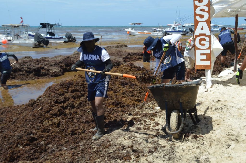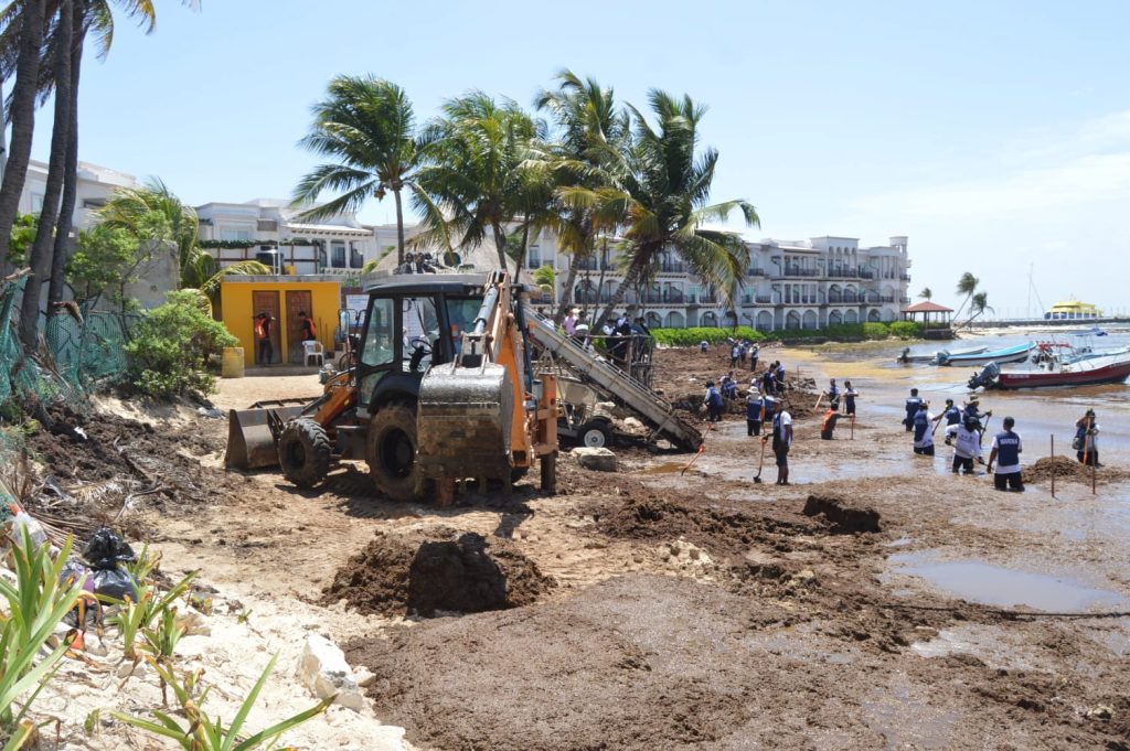 Actualmente, más de 100 personas trabajan en campo, entre personal municipal, brigadas estatales y 50 elementos navales desplegados por la Secretaría de Marina, así como maquinaria especializada y sargaceras marítimas proporcionadas por el Estado.